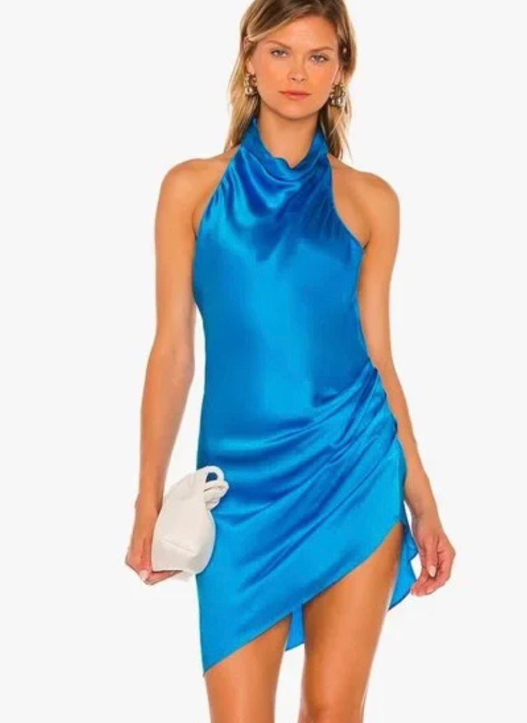 Amanda Uprichard Blue HIgh-Neck Satin Dress, Size XS