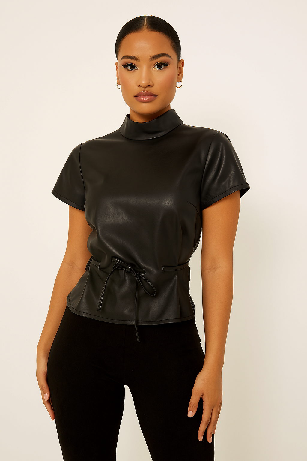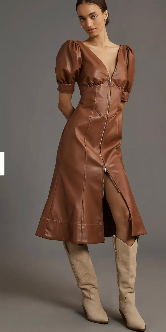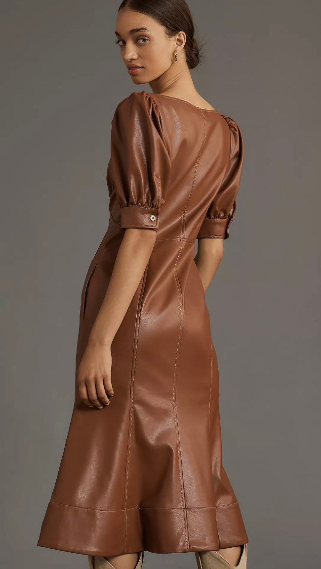 Brown Anthropologie Faux Leather Puff-Sleeve Zip-Front Midi Dress, Size 4