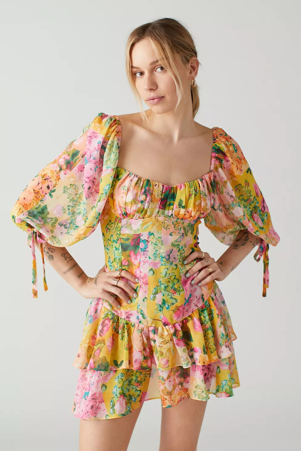 For Love & Lemons Nina Floral Dropped-Waist MIni Dress Multicolor Floral Size small
